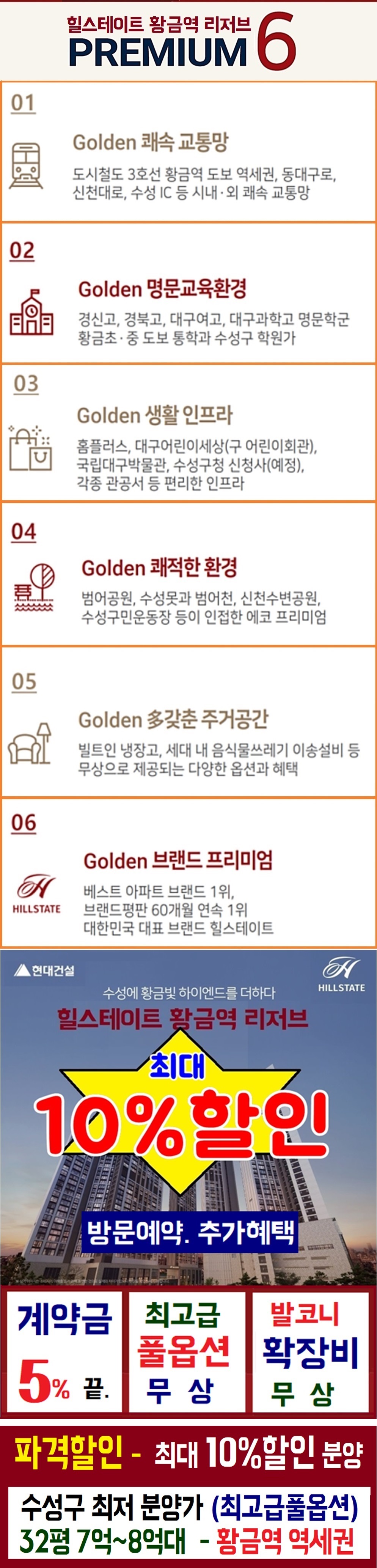 힐스테이트 황금역 리저브 모델하우스   주소: 대구 수성구 황금동 844   |   분양 광고 관리자: 김지원 010-7605-7600